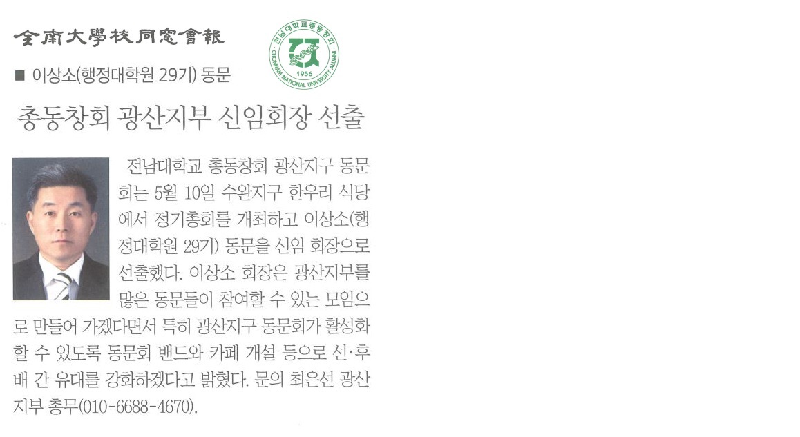 ÀÌ»ó¼Ò ´ëÇ¥ Àü³²´ëÇб³ Ãѵ¿Ã¢È¸ ±¤»êÁöºÎ ½ÅÀÓȸÀå ¼±Ãâ